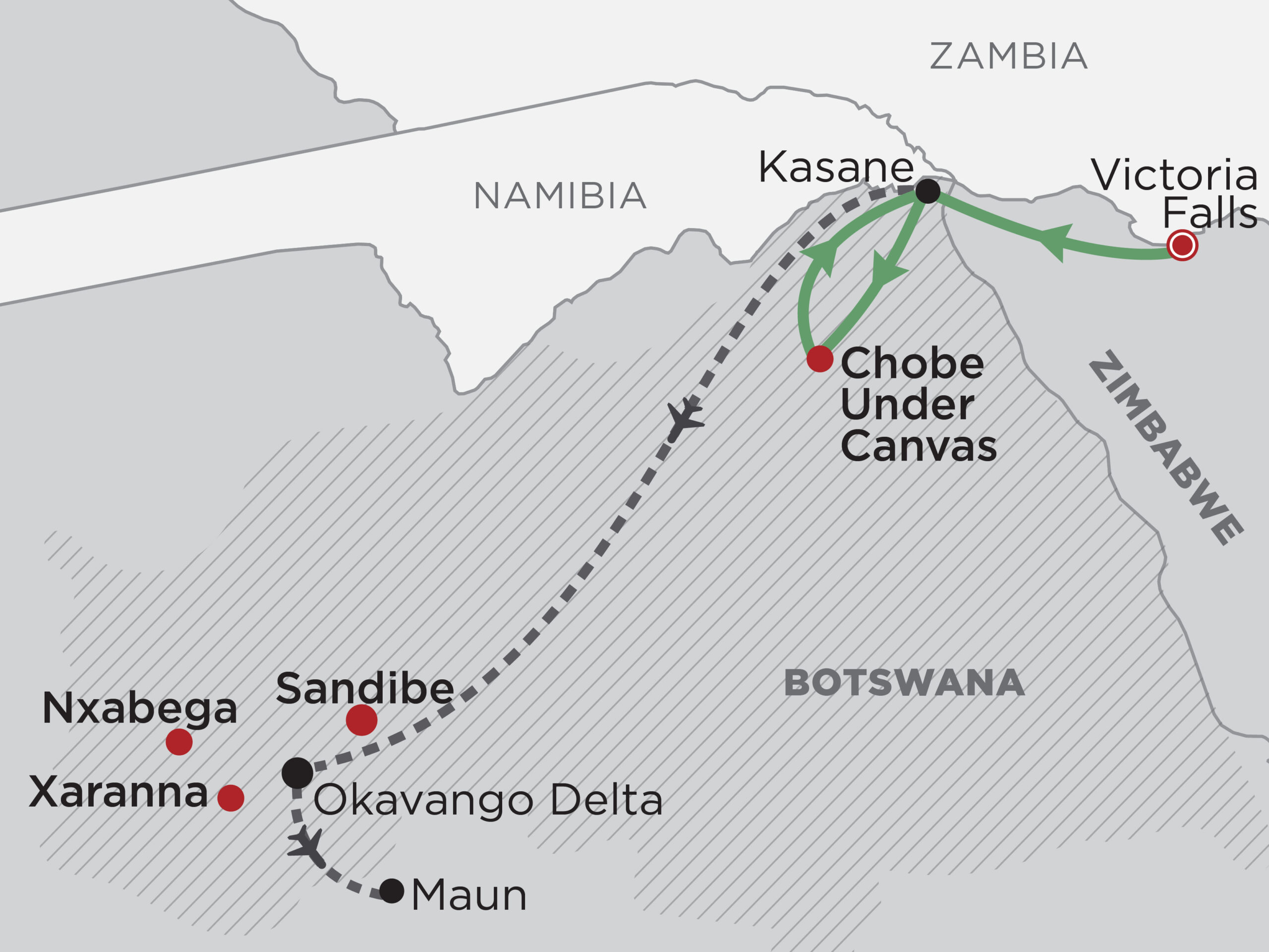 • Victoria Falls • Okavango Delta • Chobe National Park • Moremi Wildlife Reserve