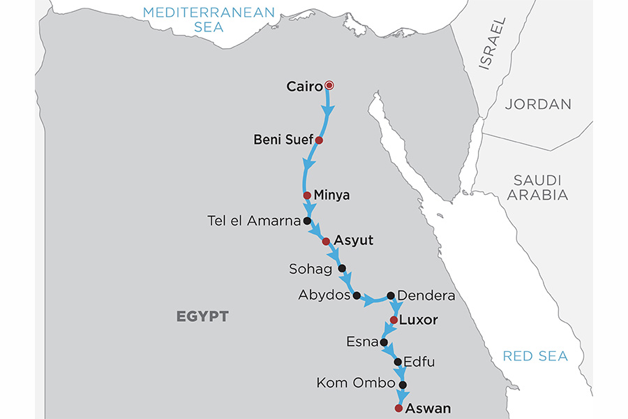 • Cairo • Beni Suef • Minya • Tel el Amarna • Abydos • Luxor • Kom Ombo • Aswan