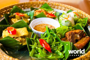 Optional culinary experience: The culinary-themed excursion offers the possibility to participate in a cooking demonstration at a local household in the village. Together with the locals, guests prepare the quite famous snack called “Nom Kruak” which is a kind of cake made from white or brown rice. Originally cooked only on one side, the Khmer invented Nom Kruak and cooked it on both sides. This dish is a tasty pre-dinner snack often consumed by locals.