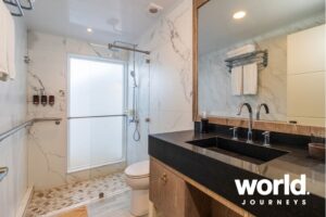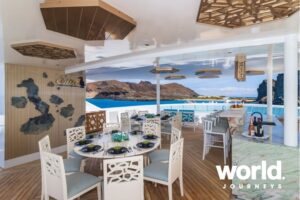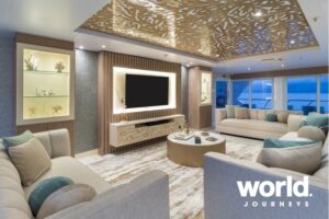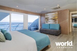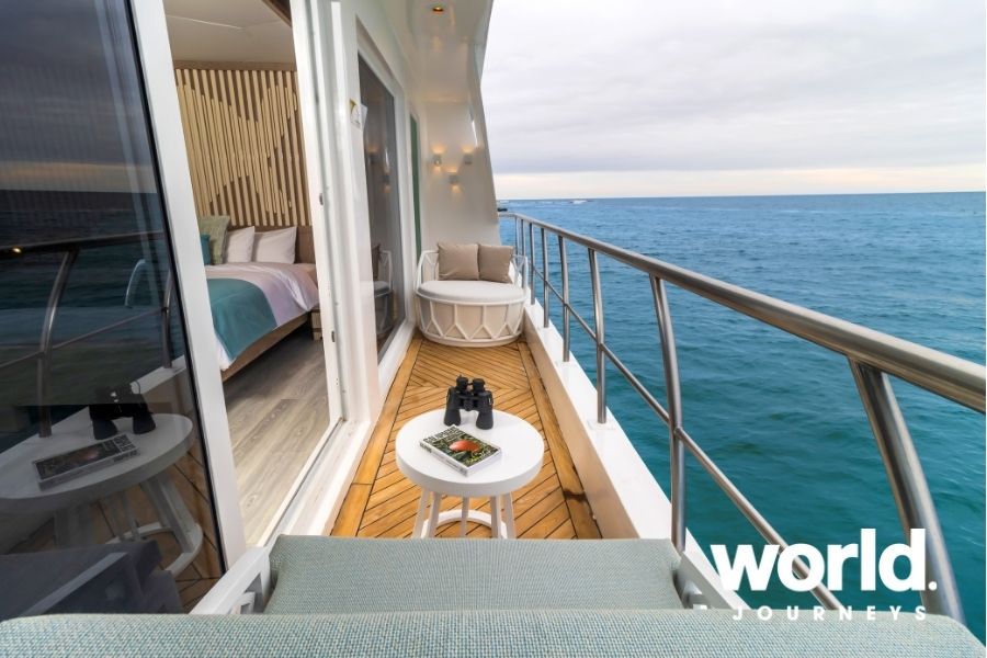 Spacious and modern cabins all feature private ensuite bathrooms. All cabins also offer a panoramic balcony for downtime and relaxation. The suites are well-appointed with amenities like air conditioning, and king-sized beds that can be converted to twins.
