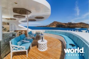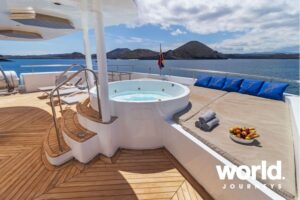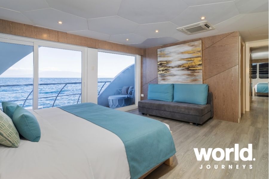 The small cruise ship M/C Elite has been internationally recertified as Carbon Neutral. Designed to offer an intimate and comfortable experience exploring the Galapagos Islands, it was built in 2019 and is known for its stability due to its twin-hull design. Elite’s spacious and luxurious cabins accommodate just 16 guests in eight cabins, all with panoramic windows and private balconies.
