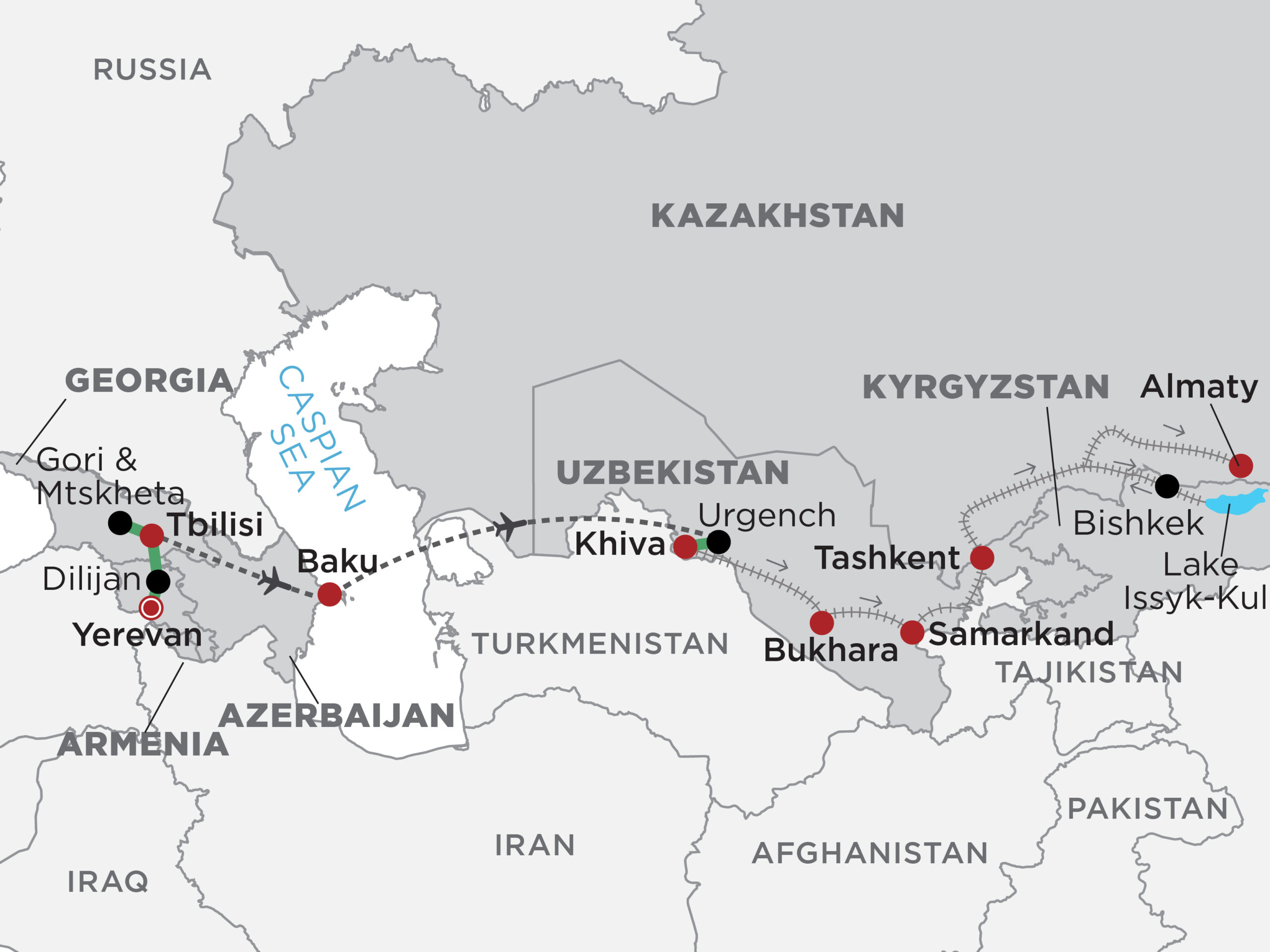 • Yerevan • Lake Sevan • Tbilisi • Telavi • Gori • Baku • Khiva • Bukhara • Samarkand • Tashkent • Lake Issyk-Kul • Almaty