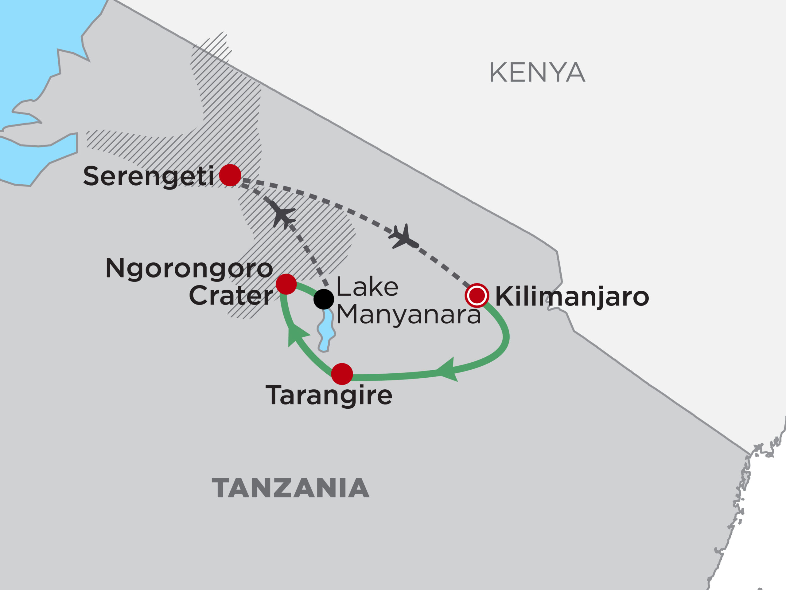 - Shared fixed-wing flights Lake Manyara > Serengeti > Kilmanjaro
