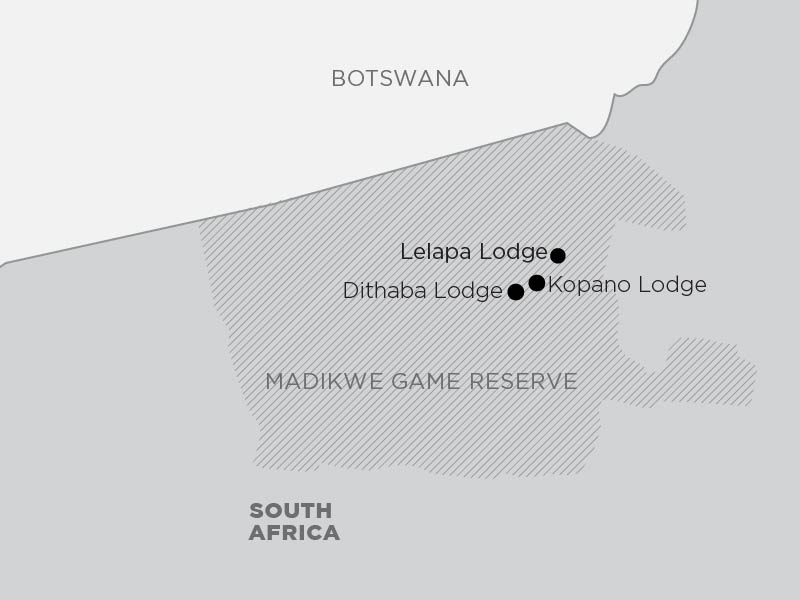 Madikwe Game Reserve is a 75,000 hectare reserve located northwest of Johannesburg along the Botswana border.
