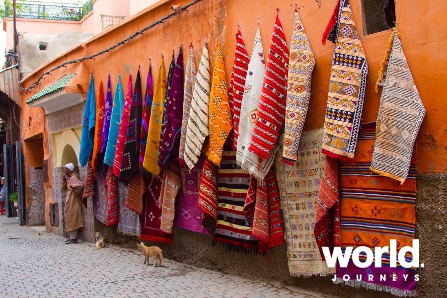 - Stroll through Marrakech’s lively souks and view beautiful tapestries