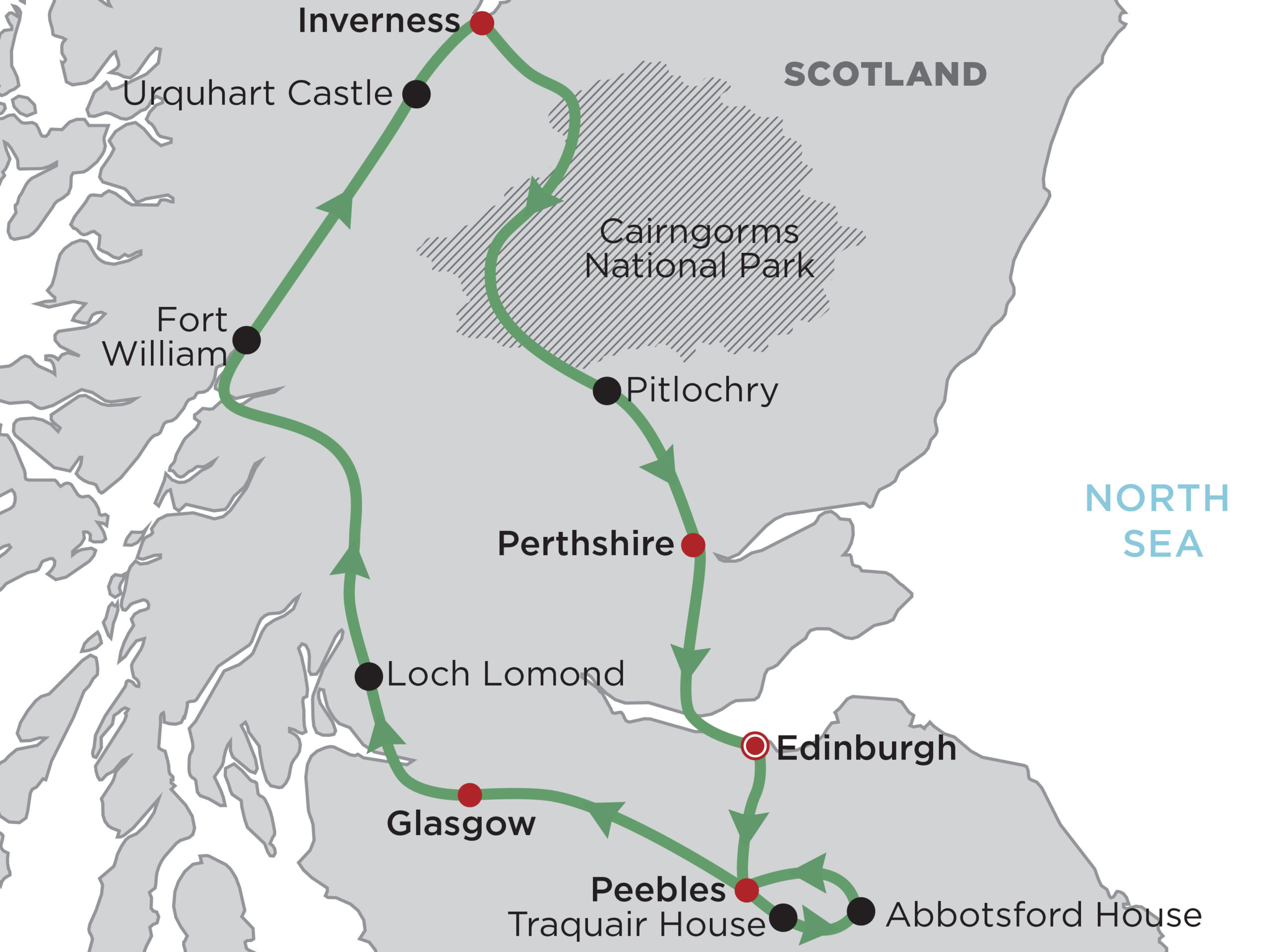 • Scottish Borders • Glasgow • Loch Lomond • Loch Ness • Inverness • Culloden • the Cairngorms • Edinburgh